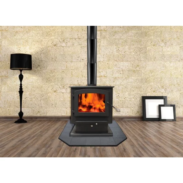 The 3.5 ft³ firebox can take logs up to 20” long and can put out enough heat to warm up to 2,400 ft² of living space. The cast iron arched door with an extra-large glass surface provides a great view of this stove’s beautiful burn and makes a cozy addition to any room.